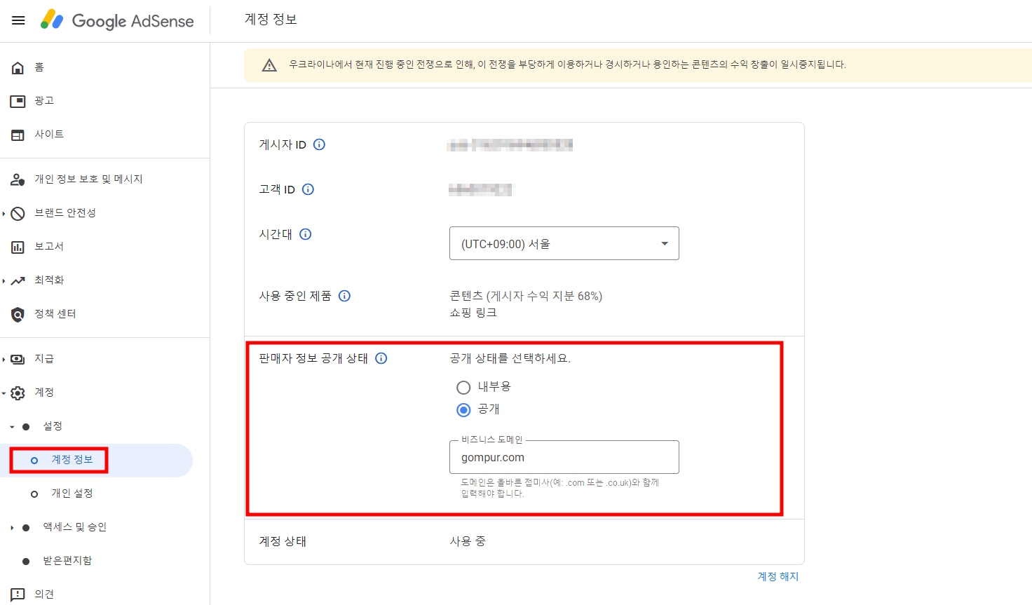 애드센스 내에 나의 정보를 명확히