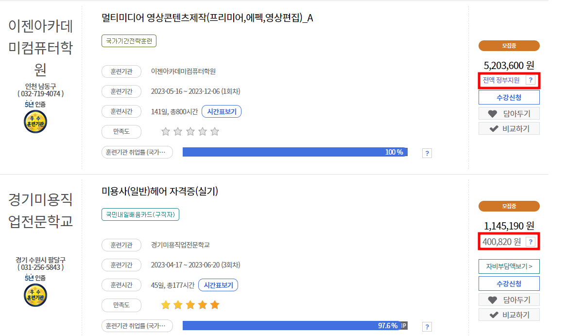 훈련 과정에 따라 자기 부담금이 조금씩 있을 수 있습니다.