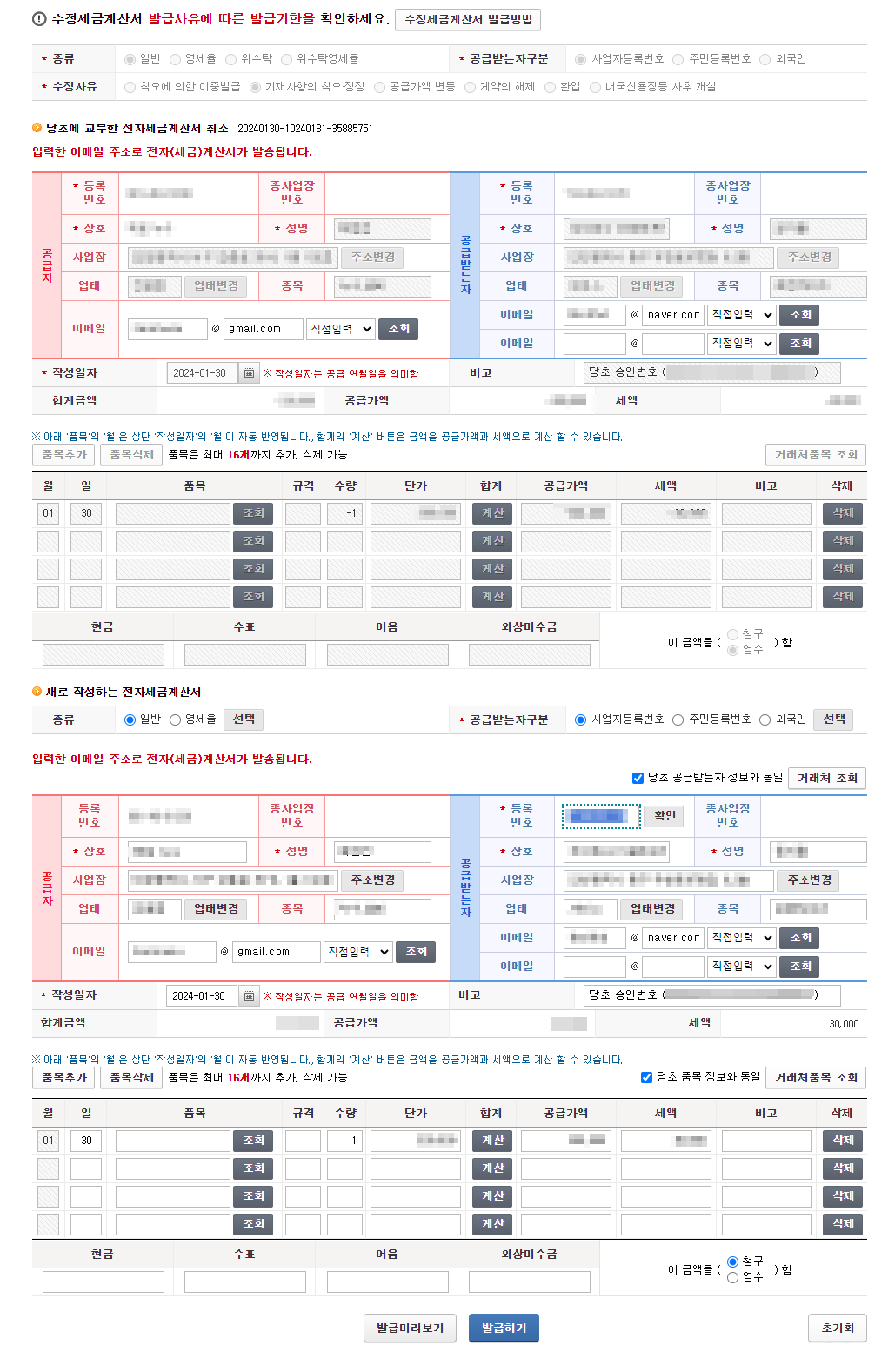 발급했던 세금계산서와 다시 발급한 세금계산서가
