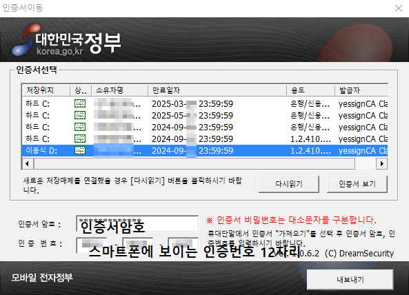 스마트폰으로 인증서 내보내기를 눌러주면