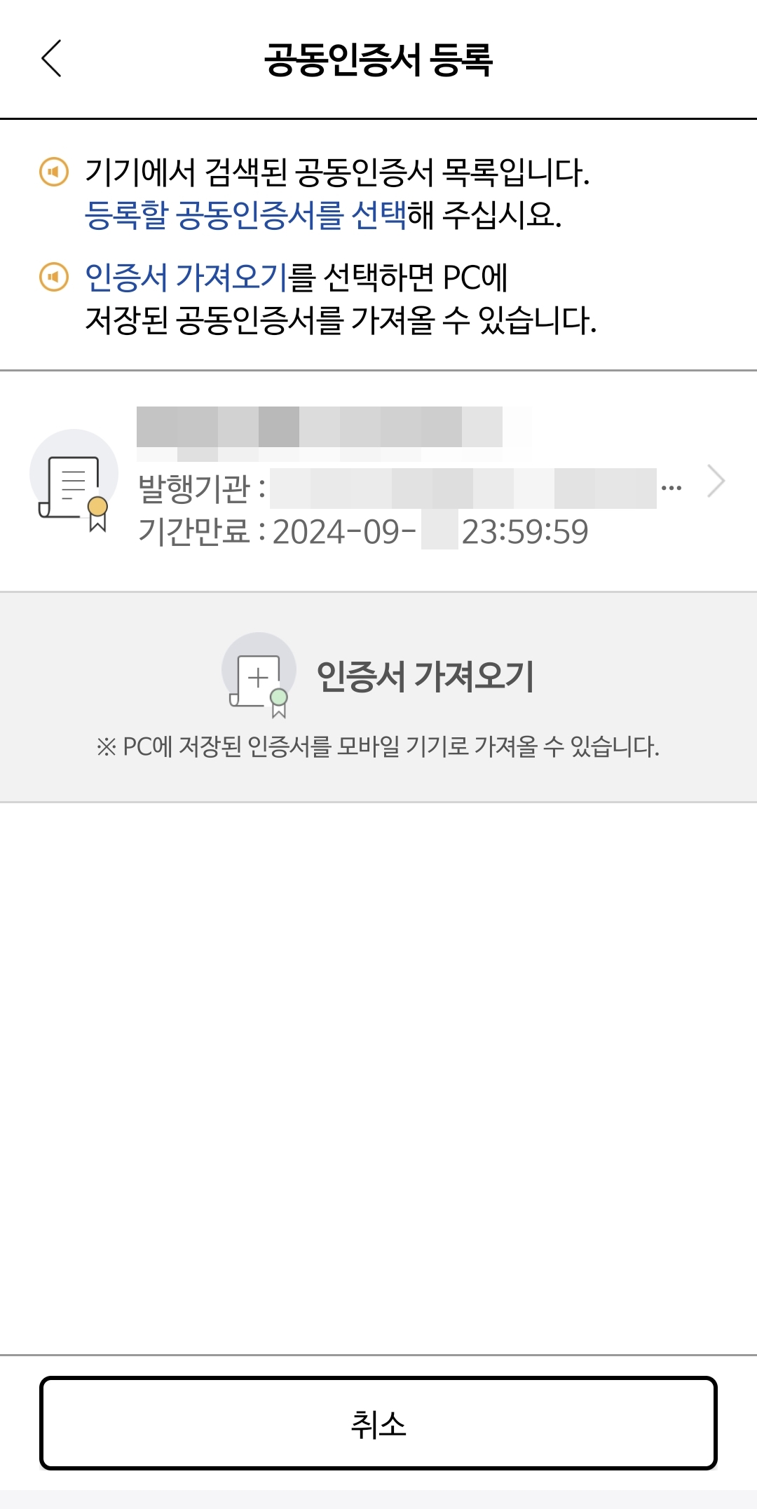 스마트폰으로 인증서 복사를 위해