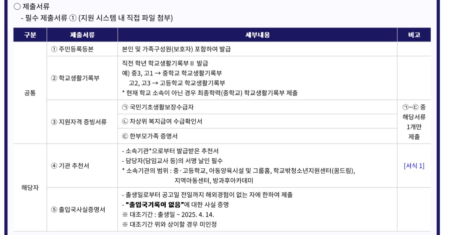주민등록등본 / 학교생활기록부 / 지원자격 증빙서류/
