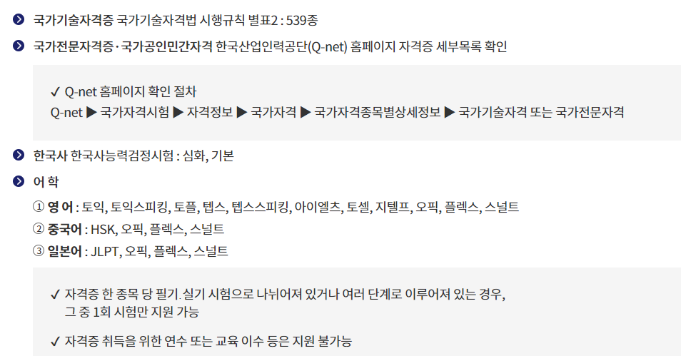 | 지원내용 | 1월1일부터 응시한 시험이 있다면 1인 1회 자격증 시험 응시료 지원 |