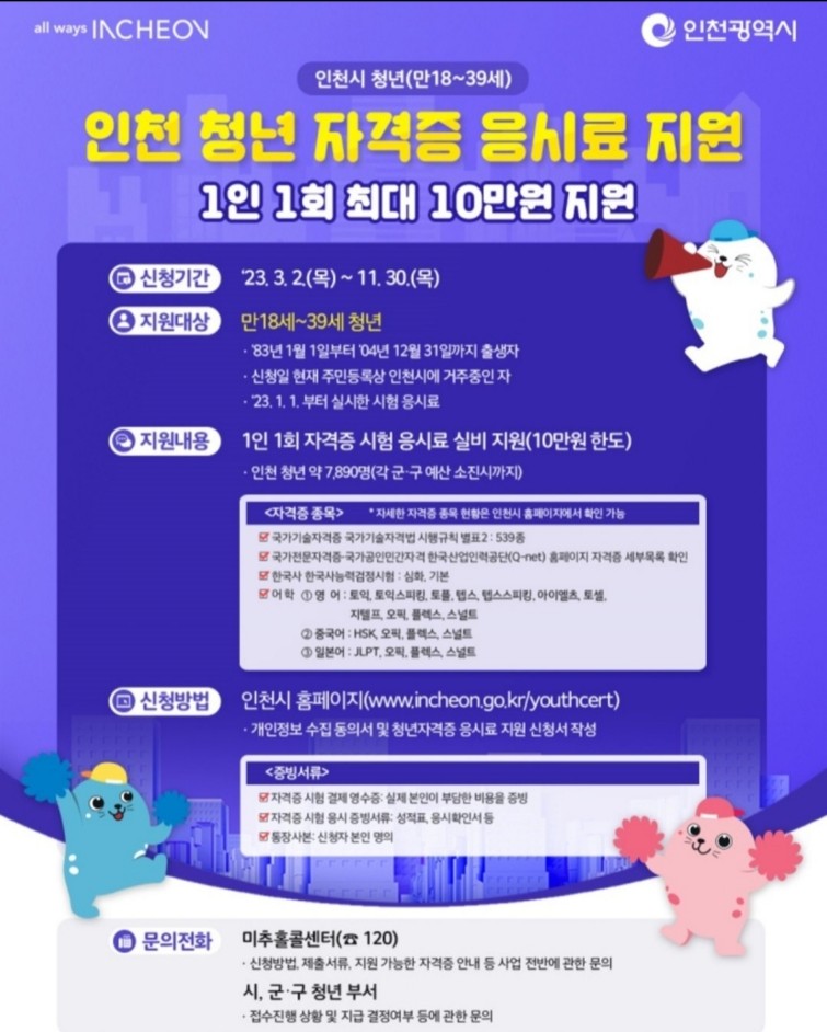 1인 1회 자격증 시험 응시료를 지원합니다.